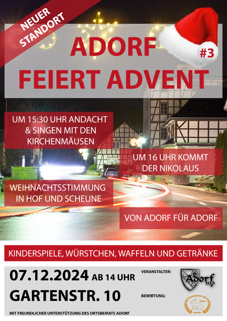 Zum dritten Mal heißt es in diesem Jahr wieder „Adorf feiert Advent“. Am 07.12.2024 ab 14 Uhr wird der gemütliche Nachmittag diesmal im Hof in der Gartenstraße 10 stattfinden. Hier besteht die Möglichkeit bei schlechter Witterung in eine Scheune auszuweichen und trotzdem den Tag mit Getränken, Würstchen und Waffeln zu genießen. Hierbei unterstützen unter anderem die „Rammelow AG“ und der Schmittenclub Adorf. Gegen 15:30 Uhr werden die Kirchenmäuse mit einigen Weihnachtsliedern den Nachmittag musikalisch begleiten, außerdem wird es eine kleine weihnachtliche Andacht zusammen mit ihnen geben. Gegen 16 Uhr wird wieder der Nikolaus erwartet und kleine Geschenke an die Kinder verteilen.